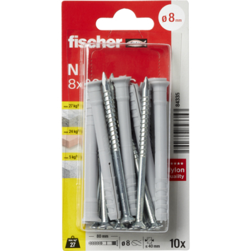 Fischer N 8x80/40 S slagplug met 10 stuks zijn van toepassing op verschillende soorten materialen zoals beton, wandverbinding en metaal. Maximaal te belasten tot 27 kg afhankelijk van het materiaal. Gebruik voor het boren van het gat een boor van Ø8mm. De plug is 80mm lang, en de schroef is 85mm en Ø5mm. Zeer geschikt voor het monteren van houten regelwerk. Geleverd als 10 slagpluggen.