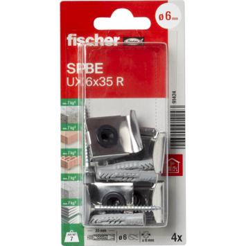 Fischer SPBE + Sx6. Deze spiegelklemmen zijn geschikt voor massieve bouwstoffen en metselwerk. Tevens ook geschikt voor het bevestigen van schilderijen etc.