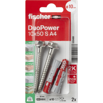 Fischer duopower 10x50mm S A2 K NV. Deze sterke alleskunner bestaat uit 2 componenten en is geschikt voor elke ondergrond. Met 3 werkingprincipes is dit de ideale plug voor elke ondergrond en het is duidelijk voelbaar wanneer de schroef goed is aangedraaid.