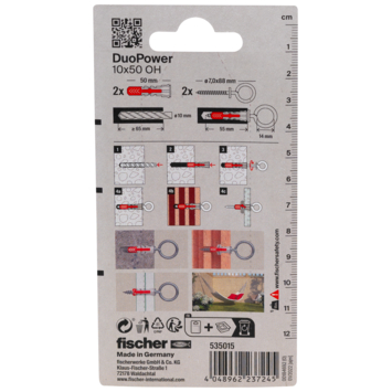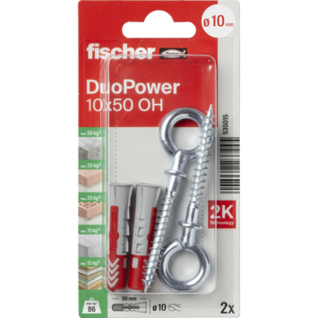 Fischer duopower 10x50mm OH K NV. Deze sterke alleskunner bestaat uit 2 componenten en is geschikt voor elke ondergrond. Met 3 werkingprincipes is dit de ideale plug voor elke ondergrond en het is duidelijk voelbaar wanneer de schroef goed is aangedraaid.