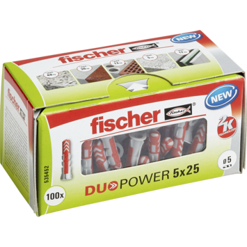 Fischer duopower 5x25mm DHZ. Deze sterke alleskunner bestaat uit 2 componenten en is geschikt voor elke ondergrond. Met 3 werkingprincipes is dit de ideale plug voor elke ondergrond en het is duidelijk voelbaar wanneer de schroef goed is aangedraaid.