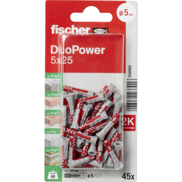 Fischer duopower 5x25mm K NV. Deze sterke alleskunner bestaat uit 2 componenten en is geschikt voor elke ondergrond. Met 3 werkingprincipes is dit de ideale plug voor elke ondergrond en het is duidelijk voelbaar wanneer de schroef goed is aangedraaid.