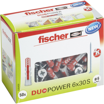 Fischer duopower 6x30mm S DHZ. Deze sterke alleskunner bestaat uit 2 componenten en is geschikt voor elke ondergrond. Met 3 werkingprincipes is dit de ideale plug voor elke ondergrond en het is duidelijk voelbaar wanneer de schroef goed is aangedraaid.