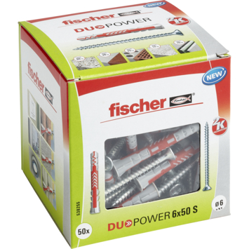 Fischer duopower 6x50mm. Deze sterke alleskunner bestaat uit 2 componenten en is geschikt voor elke ondergrond. Met 3 werkingprincipes is dit de ideale plug voor elke ondergrond en het is duidelijk voelbaar wanneer de schroef goed is aangedraaid.
