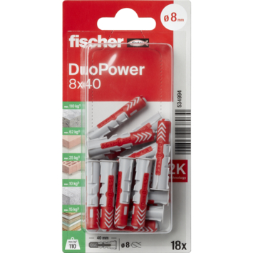 Fischer duopower 8x40mm K NV. Deze sterke alleskunner bestaat uit 2 componenten en is geschikt voor elke ondergrond. Met 3 werkingprincipes is dit de ideale plug voor elke ondergrond en het is duidelijk voelbaar wanneer de schroef goed is aangedraaid.