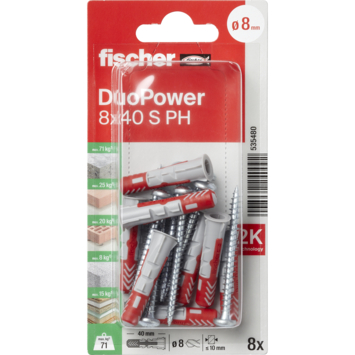 Fischer duopower 8x40mm PH K NV. Deze sterke alleskunner bestaat uit 2 componenten en is geschikt voor elke ondergrond. Met 3 werkingprincipes is dit de ideale plug voor elke ondergrond en het is duidelijk voelbaar wanneer de schroef goed is aangedraaid.