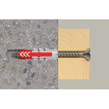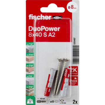 Fischer duopower 8x40mm S A2 K NV. Deze sterke alleskunner bestaat uit 2 componenten en is geschikt voor elke ondergrond. Met 3 werkingprincipes is dit de ideale plug voor elke ondergrond en het is duidelijk voelbaar wanneer de schroef goed is aangedraaid.