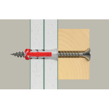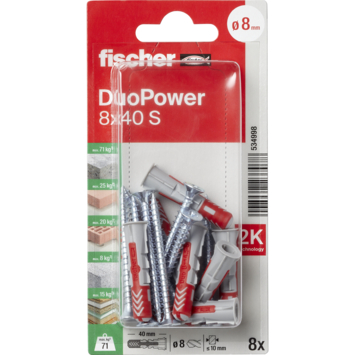 Fischer duopower 8x40mm SK NV. Deze sterke alleskunner bestaat uit 2 componenten en is geschikt voor elke ondergrond. Met 3 werkingprincipes is dit de ideale plug voor elke ondergrond en het is duidelijk voelbaar wanneer de schroef goed is aangedraaid.