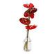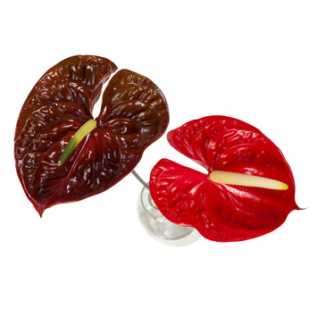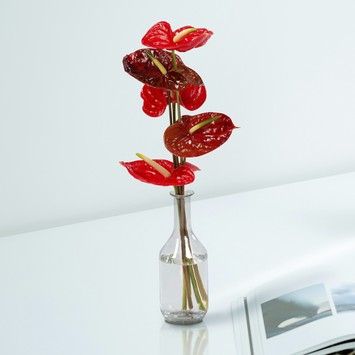 De Flamingoplant (Anthurium) herken je direct aan zijn opmerkelijke rode bloemen. Officieel zijn het niet de bloemen die deze felle rode kleur hebben, maar de schutbladeren van deze plant. Aan de voet van de felgekleurde bladeren groeit een kleine kolf met veel, kleine bloempjes. Dit boeket bestaat uit vijf mooie Flamingo planten op steel.