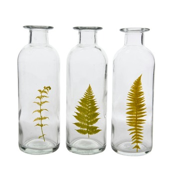 Fles glas plant helder Ø9x27 cm is een bijzondere decoratieve fles. De fles kenmerkt zich door het opvallende blad van een varen dat in de fles zit. De fles is er in drie uitvoeringen met elk een ander blad in de fles. Fles glas plant helder Ø9x27 cm is 27 centimeter hoog en heeft een diameter van 9 centimeter