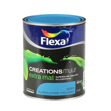 Flexa Creations muurverf extra mat turquoise holiday 1 l is een superieure kwaliteit muurverf voor muren en plafonds binnenshuis. Doordat de verf goed reinigbaar en schrobvast is, is ze uitermate geschikt voor ruimten die gemakkelijk vochtig of vuil worden, zoals bijvoorbeeld de badkamer, kinderkamer of keuken. Je kan zo langdurig genieten van je mooie matte muren. Met de unieke en speciaal ontworpen kleuren van Flexa Creations kun je kleur geven aan je verbeelding. Waarom je complete inrichting niet eens helemaal omgooien? Kleur is immers de leukste en sterkste manier om je interieur te veranderen en met de Flexa Creations collectie is het heel eenvoudig. Ga de strijd aan met doorsnee muren en geef ze een verrassende, nieuwe kleur. Iets eigentijds, iets onverwachts, je hele interieur leeft ervan op. Tot slot heeft Flexa Creations extra matte muurverf een uitstekende dekking en is gemakkelijk aan te brengen.