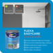 Flexa Easycare Badkamer is speciaal ontwikkeld voor muren in vochtige ruimtes zoals de badkamer. Dankzij de schimmelwerende en waterafstotende technologie is de verf bestand tegen condens, vlekken, vocht en schimmel. De verf is eenvoudig schoon te maken met een vochtige doek. De verf is watergedragen, geurarm en geschikt voor muren en plafonds in badkamers en vergelijkbare ruimtes. Niet verwerken beneden 10°C. Bij 20°C is de verf na 1 uur stofdroog en overschilderbaar na 6 uur. Het rendement van de verf is 10m² per liter.