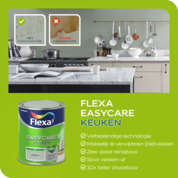 Flexa Easycare Keuken is speciaal ontwikkeld voor keukens waar muren worden aangetast door vetspatten, vocht en vuil. Dankzij de vlekwerende technologie is de verf bestand tegen deze omstandigheden en eenvoudig te reinigen met een vochtige doek. De verf is watergedragen, geurarm en geschikt voor muren en plafonds in keukens en soortgelijke ruimtes. De verf niet verwerken beneden 10°C. Bij 20°C is de verf na 1 uur stofdroog en overschilderbaar na 6 uur. De verf heeft een rendement van 10m² per liter.