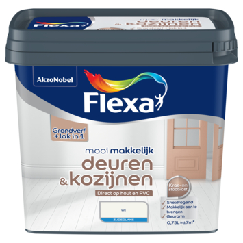 Flexa Mooi Makkelijk Deuren & Kozijnen Wit 750ml is ideaal voor het schilderen van binnendeuren en kozijnen van hout, melamine, MDF of bestaande verf- en kunststoflagen. De lak heeft een zijdeglans afwerking die zorgt voor een mooi resultaat met een lichte glans. De lak hecht goed op vrijwel alle ondergronden en laat zich gemakkelijk aanbrengen met een kwast of roller. Zo geef je deuren en kozijnen eenvoudig mooi verzorgde uitstraling.