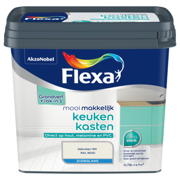 Flexa Mooi Makkelijk Keukenkasten Gebroken Wit / RAL 9010 750ml is ideaal voor het schilderen van keukenkastjes van hout, melamine, formica of hard kunststof. De zijdeglans lak heeft een sterke afwerking met lichte glans. De lak is goed te verwerken met een kwast of roller voor een streeploos resultaat dat goed bestand is tegen dagelijks gebruik.