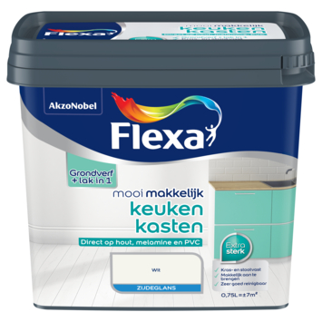 Flexa Mooi Makkelijk Keukenkasten Wit 750ml is ideaal voor het schilderen van keukenkastjes van hout, melamine, formica of hard kunststof. De zijdeglans lak heeft een sterke afwerking met lichte glans. De lak is goed te verwerken met een kwast of roller voor een streeploos resultaat dat goed bestand is tegen dagelijks gebruik.