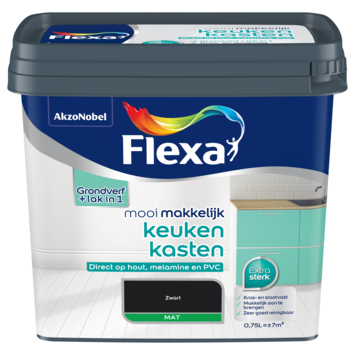 Flexa Mooi Makkelijk Keukenkasten Zwart Mat 750ml is ideaal voor het schilderen van keukenkastjes van hout, melamine, formica of hard kunststof. De matte afwerking geeft een moderne, rustige uitstraling zonder glans. Hierdoor zijn dagelijkse gebruikssporen, zoals krassen minder zichtbaar. De lak is goed te verwerken met een kwast of roller voor een egaal, streeploos resultaat dat goed bestand is tegen dagelijks gebruik.