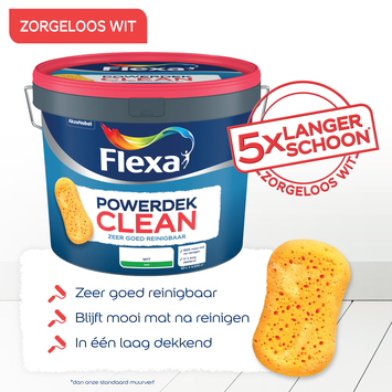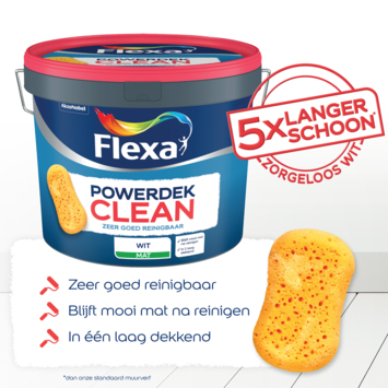 Flexa Powerdek Clean behoudt de matte uitstraling en kleur, ook bij het schoonmaken. De muurverf is geschikt voor ruimtes die gemakkelijk vuil worden, zoals kinderkamers, keukens en woonkamers. De muurverf is geschikt voor ondergronden, zoals stucwerk, beton, steen, gipskarton, glasweefsel, papierbehang en eerder geschilderde muren en plafonds. Powerdek Clean De verf niet verwerken beneden 10°C. Bij 20°C is de verf na 2 uur stofdroog en overschilderbaar na 6 uur. De verf heeft een rendement van 10m² per liter.