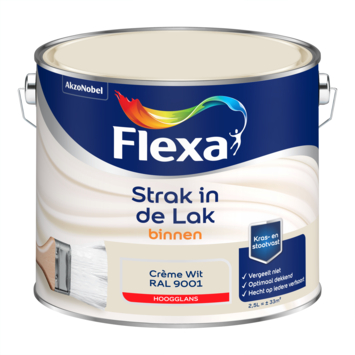 Flexa Strak in de lak voor binnen ral 9001 crèmewit hoogglans 2,5 liter is een hoogglans aflak op waterbasis die je binnen kunt gebruiken. Je kunt het met de kwast of met de roller aanbrengen op onder andere deuren en kozijnen. Doordat de lak sneldrogend is kan je het snel overschilderen. Ook is de lak geurarm en vergeelt niet. Door de goede dekking en krasvastheid krijg je met Flexa Strak in de lak eenvoudig en snel een mooi en langdurig eindresultaat.