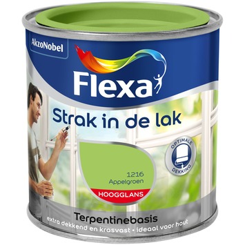 Flexa Strak in de Lak hoogglans appelgroen 250 ml is een hoogglans aflak op terpentinebasis die je zowel binnen als buiten kunt gebruiken. Je kunt het met de kwast of met de roller aanbrengen op onder andere deuren en kozijnen. Door de extra dekking en goede vloeiing bereik je met Flexa Strak in de Lak eenvoudig en snel een mooi en strak eindresultaat. Flexa Strak in de Lak is krasvast en vergeelt bijna niet. Daardoor maak je met Flexa Strak in de Lak duurzaam en mooi schilderwerk.
