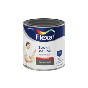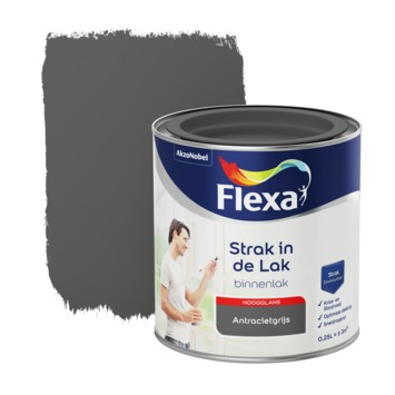 Flexa Strak in de lak voor binnen antraciet grijs hoogglans 250 ml is een hoogglans aflak op waterbasis die je binnen kunt gebruiken. Je kunt het met de kwast of met de roller aanbrengen op onder andere deuren en kozijnen. Doordat de lak sneldrogend is kan je het snel overschilderen. Ook is de lak geurarm en vergeelt niet. Door de goede dekking en krasvastheid krijg je met Flexa Strak in de lak eenvoudig en snel een mooi en langdurig eindresultaat.