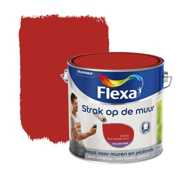 Flexa Strak op de Muur muurverf brandweer rood 2,5 l is een oplosmiddelvrije, matte muurverf voor binnen. Het is geschikt voor muren en plafonds binnenshuis, ook voor ruimten die vochtig kunnen worden, zoals badkamers en keukens. Flexa Strak op de Muur heeft een goede dekking en is eenvoudig aan te brengen met een blokwitter of roller. De muurverf kan aangebracht worden op ondergronden zoals muren, plafonds, schoon metselwerk, papierbehang, gipskarton en (glad) pleisterwerk. Het is daarnaast schrobvast en daardoor eenvoudig reinigbaar. Dat komt vooral van pas in ruimten die gevoelig zijn voor vuil worden, bijvoorbeeld een hal of een kinderkamer. De kleuren van Flexa Strak op de Muur muurverf zijn kleurecht en blijven lang mooi, daardoor ben je verzekerd van een perfect en blijvend mooi eindresultaat.