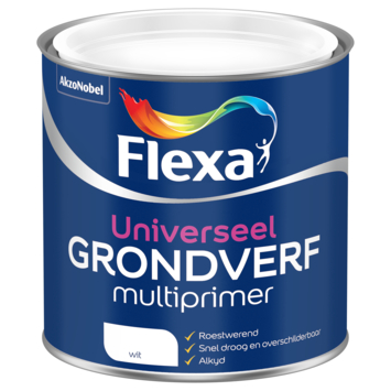 Flexa universele multiprimer wit 250 ml is geschikt als hechtlaag voor diverse ondergronden zowel binnen als buiten. Het hecht uitstekend en is prima roestwerend waardoor je het op veel verschillende ondergronden kunt toepassen. Denk bijvoorbeeld aan hout, harde kunststoffen, geglazuurde tegels, bestaand schilderwerk, ferro metalen zoals ijzer en staal en non-ferro metalen zoals koper en zink. Flexa multiprimer droogt zeer snel waardoor je weinig last hebt van inwaaiend stof in je net aangebrachte primerlaag. Dit draagt bij aan een strak eindresultaat van je klus. Je kunt na droging de Flexa universele multiprimer met elke gewenste terpentine- of waterverdunbare Flexa aflak afwerken.