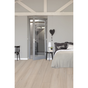 De Flexxfloors Click Deluxe Misty, heeft een mooie houtstructuur afwerking waardoor de vloer tot leven komt. Flexxfloors Click Deluxe is nauwelijks te onderscheiden van echt houten vloeren; de planken geven een zacht en warm gevoel aan je voeten. De Misty geeft, dankzij de unieke lichte kleur, een lichte en warme uitstraling aan je interieur. Daarnaast hebben de planken een v-groef aan alle zijdes.