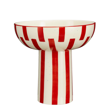 Geef je tafel een zomerse uitstraling met deze fruitschaal op voet. Deze handgemaakte schaal van stevig steengoed heeft een frisse witte basis met een speels rood streepmotief. Perfect om fruit of andere lekkernijen stijlvol te presenteren tijdens zonnige dagen. Met een hoogte van 28 cm en een diameter van 28,5 cm is het een echte blikvanger op elke tafel. Een sfeervolle keuze voor elke zomer- of lentesetting!