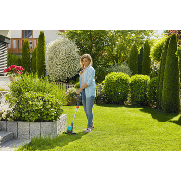 Gemakkelijk en snoerloos gazon trimmen: de accutrimmer EasyCut 23 / 18V P4A maakt het mogelijk om uw gazon in vorm te krijgen. Zelfs op plaatsen die meestal moeilijk te bereiken zijn! De EasyCut 23 / 18V P4A is erg licht, waardoor het gebruik van het apparaat comfortabeler is. Je kunt de snoerloze trimmer langdurig gebruiken zonder je moe te voelen. Looptijd van de trimmer is maximaal 45 minuten met de batterij, die zich naast de oplader bevindt, inbegrepen in de set. Na een snelle en gemakkelijke montage is de EasyCut 23 / 18V P4A direct inzetbaar. Pas voordat u begint de snoerloze trimmer eenvoudig aan uw behoeften aan - zowel de handgreep is verstelbaar als de telescopische steel. Op deze manier kunt u tijdens het trimmen een rechte en ontspannen houding aanhouden. Wil je onder obstakels door snijden? Kantel dan eenvoudig de kop van de trimmer. Tijdens het werken is de laadstatus altijd zichtbaar op de led-batterijstatusindicator op het handvat. Maak je geen zorgen over planten die in een bloembed aan de rand van het gazon groeien. De uittrekbare en afneembare plantbeschermer zorgt ervoor dat uw bloemen en struiken goed beschermd zijn. De GARDENA accutrimmer EasyCut 23 / 18V P4A als kant-en-klare set wordt geleverd met een oplader en een 18V POWER FOR ALL-accu. De POWER FOR ALL ALLIANCE is een van de grootste merkoverschrijdende batterijallianties van toonaangevende fabrikanten. De accu is daarom compatibel met tal van andere gereedschappen in huis en tuin - wat betekent dat u er niet langer voor elk product een hoeft te kopen. U bespaart geld en blijft te allen tijde flexibel! Passie aangedreven door GARDENA - Tuingereedschap op batterijen dat u de vrijheid geeft om te creëren.