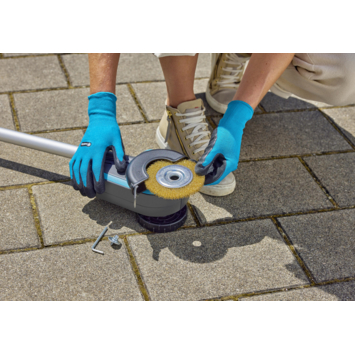 De stalen voegenborstel is geschikt voor robuuste oppervlakken en smalle voegen. Voor krasgevoelige oppervlaktes wordt het gebruik van een apart verkrijgbare nylon voegenborstel met zachtere haren aanbevolen. De accu-voegenborstel EasyWeed 1800 biedt een individuele snelheidsregeling, waardoor gevoelige plekken voorzichtig kunnen worden gereinigd met minder borstelomwentelingen. Wanneer meer kracht nodig is, kan hij tot 1.800 tpm gaan. Het LED-display op het handvat toont de resterende acculading. De benodigde 18 volt systeemaccu's zijn gebaseerd op Bosch-technologie en zijn compatibel met diverse andere tuingereedschappen van GARDENA en ook met producten van andere fabrikanten in de POWER FOR ALL alliantie.