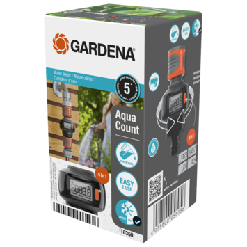 Met de GARDENA AquaCount zie je in één oogopslag hoeveel water je verbruikt. Je sluit ‘m aan op de kraan of slang, horizontaal of verticaal, afhankelijk van wat handig is. De grote display draai je naar je toe en laat vier functies zien: waterverbruik per cyclus, per dag, per seizoen en de actuele doorstroming. De batterij wordt meegeleverd, dus je kunt direct starten. Hij is eenvoudig schoon te maken en bestand tegen uv en vorst, dus je laat ‘m gewoon buiten hangen.