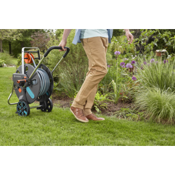 De Gardena slangenwagen AquaRoll L Easy is makkelijk in gebruik en berg je snel en eenvoudig op. De ergonomische hendel aan de zijkant van de slangenwagen zorgt voor het snel kunnen oprollen van de tuinslang. De spuitkop van de tuinslang kan je na gebruik eenvoudig vastmaken door hem vast te klemmen met de clip aan de bovenkant van de AquaRoll L Easy. Met de Aquaroll L van Gardena kan je tot wel 50 meter slang opbergen. De set wordt geleverd inclusief tuinslang. De slangenwagen is ook verkrijgbaar in de kleinere maten S en M.