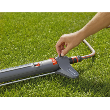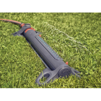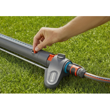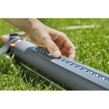 De Gardena Aquazoom M E4 is de ideale sproeier voor rechthoekige oppervlakken. De sproeier heeft een traploos instelbare reikwijdte van 7 meter tot maximum 18 meter. Daarmee kan de sproeier oppervlakken van 25 m² tot 250 m² besproeien. Ook de sproeibreedte kan je afzonderlijk instellen van 3,5 meter tot max. 14 meter breed. Je kan de sproeier ook monteren op een Gardena sproeierstatief, zodat je grotere planten ook van bovenaf kan besproeien.