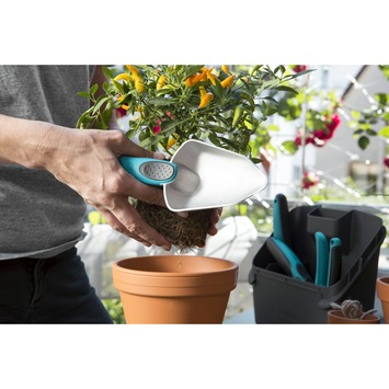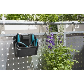 De Gardena balkon box is een must have voor de kleinere tuin. Deze set bestaat uit een snoeischaar, tuinschep en tuinvorkje en een box waar de artikelen makkelijk in opgeslagen kunnen worden, de deksel kan samen met het borsteltje gebruikt worden als stoffer en blik.