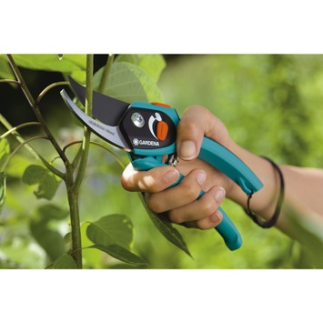 De Gardena Comfort snoeischaar is een bijzonder comfortabele en ergonomische snoeischaar. De snoeischaar heeft een extra smalle snoeikop voor het precies knippen van druiventakken, bloemen, jonge twijgen en jong hout. De openingswijdte van de handgrepen is instelbaar, zodat je de snoeischaar kunt afstemmen op je eigen handen. De snoeischaar heeft een gebogen snoeikop met precisiegeslepen messen met anti-kleefcoating. Ook heeft de snoeischaar een sapgeul en een draadafsnijder. De snoeischaar heeft een werkpositie voor krachtsnoei en een positie voor snelsnoei. Met de enkelhandige veiligheidsvergrendeling kun je de snoeischaar gemakkelijk vergrendelen. Garantietermijn 25 jaar.