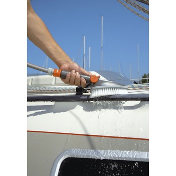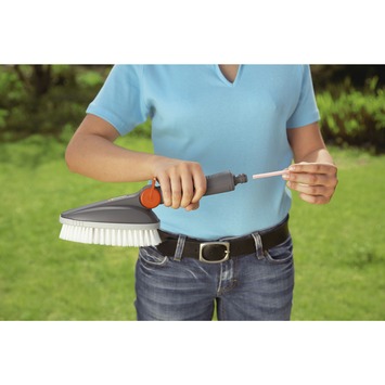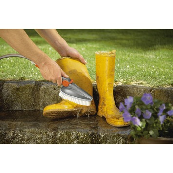 Gardena handschrobber met waterdoorvoer via Original Gardena Systemaansluiting. Waterdoorvoer comfortabel traploos regelbaar en afsluitbaar. Comfortabel met één hand te bedienen. Zachte kunststof rand voorkomt krassen. Platte, lichte borstelhouder om nauwe plaatsen moeiteloos schoon te maken. Bijmenging van Gardena shampoostaafjes (art. nr. 989) mogelijk. 4-kleuren displaydoos. Voor grondige reiniging van harde oppervlakken, bijvoorbeeld tuingereedschap en tuinmeubelen.