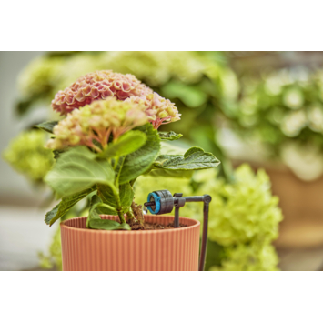 Gebruik de verstelbare Einddruppelaar van GARDENA als onderdeel van het Micro-Drip-System om afzonderlijke potplanten aan het uiteinde van de 4,6 mm Aanvoerbuis te bewateren. In combinatie met de 13 mm Koppelingsbuis is de lokale bewatering van plantenrijen ook mogelijk. De drukcompenserende Einddruppelaar is ontworpen voor de uiteenlopende waterbehoeften van planten. Je kan daarom de wateroutput verstellen tussen 1 en 8 liter per uur. Je kan de Einddruppelaar daardoor op veel manieren gebruiken, bijvoorbeeld op balkons, terrassen en zelfs bij hoogteverschillen, zoals hellingen. Planten zoals tomaten, kruiden of kwetsbare zaailingen krijgen de optimale dosering. Doordat de Einddruppelaar drukcompenserend is, wordt de watertoevoer constant gehouden. De verstelbare Einddruppelaar is extreem gemakkelijk om te onderhouden en bevat een indrukwekkende, zelfreinigende labyrinttechnologie, die verstopping voorkomt. De slimme Easy & Flexible-koppelingstechnologie maakt de installatie handig en eenvoudig. Schroef het MDS-onderdeel in, breid hem flexibel uit en ontkoppel de onderdelen weer net zo makkelijk van elkaar. Micro-Drip-System. Zo zorg je goed voor je planten maar bespaar je toch water. Makkelijk en nauwkeurig bewateren, om water en tijd te besparen.