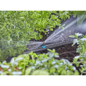 Met de Micro Strook Sprinkler van GARDENA bewater je je planten met een fijne sproeinevel. Hij sproeit in twee richtingen en is ideaal voor het effectief bewateren van lange, nauwe stroken, zoals bloembedden in de voortuin. Het Micro-Drip-System-onderdeel bereikt een afstand van 2,75 m in elke richting, evenals een sproeibreedte tot 0,6 m. Met behulp van het Montagegereedschap of het T-stuk voor Sproeiers kan je de sproeier installeren op de 13 mm Koppelingsbuis in slechts een paar stappen. De Verlengbuis voor Sproeiers (art. nr. 13326-20) verhoogt de positie van de sproeier. Zo blijven je planten van bovenaf besproeid worden, zelfs als ze groeien. Het Afsluitventiel (art. nr. 13207-20) is de juiste accessoire als je de bewatering wil reguleren of afzonderlijke delen van de Koppelingsbuis volledig af wil sluiten. Hij zorgt voor een optimale, waterzuinige bewatering. De GARDENA Sproeiers zijn duidelijk van elkaar te onderscheiden dankzij het intuïtief ontwerp, want je kan het sproeipatroon direct zien op de sproeikop. Het kwaliteitsproduct is in Duitsland gemaakt. Micro-Drip-System. Zo zorg je goed voor je planten maar bespaar je toch water. Makkelijk en nauwkeurig bewateren, om water en tijd te besparen.