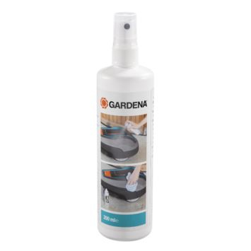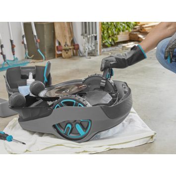 De Gardena onderhoudsset voor robotmaaiers bevat een reinigingspad tegen vuil, twee verschillende borstels, een reinigingsspray en een speciale schroevendraaier om bijvoorbeeld zelf de messen te vervangen van je maaier.