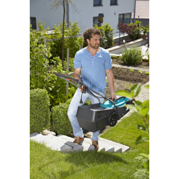Met de Gardena PowerMax 1100/32 onderhoud je eenvoudig en efficient uw gazon. Deze 1100W elektrische grasmaaier heeft een maaibreedte van 32CM en is daarmee ideaal voor de kleinere gazons. Hij is simpel te starten door het handvat tegelijkertijd met de oranje startknop in te drukken. Door zijn lichte gewicht beweeg je hem gemakkelijk over je gazon. De maaihoogte is eenvoudig instelbaar tussen de 20 en 60 millimeter. De opvangbak van 30 liter verzamelt het gemaaide gras.