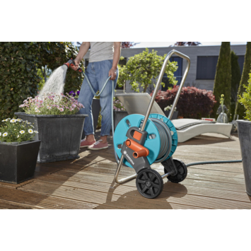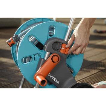 De Gardena slangenwagen aquaroll met 20 meter slang en regelbare tuinspuit is een complete set voor het bewateren van je tuin. De slangenwagen wordt geleverd inclusief 20 meter Gardena Classic tuinslang, aansluitstukken en een tuinspuit waarmee deze geschikt is voor diverse werkzaamheden. Let op: er is een aansluitstuk van de tuinslang inbegrepen, het kraanstuk is niet inbegrepen. Met de slangenwagen kun je de slang eenvoudig transporteren en opbergen. De slangaansluiting voorkomt knikken in de slang. Ook wordt het meedraaien van de slangaansluiting bij het op- en afrollen voorkomen door de draaiende, gelagerde aansluitas. De druppelstop zorgt dat er geen water wegloopt na gebruik. Dit product wordt geleverd als bouwpakket en dien je zelf in elkaar te zetten.