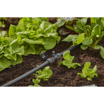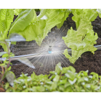 De sproeier 360° van Gardena zorgt dat je bloem- en groentebedden volledig bewaterd worden. Je kan er planten water mee geven met een fijne nevel van 360°, Dus kan je de sproeier het beste in het midden van een perk plaatsen. Het Micro-Drip-System-onderdeel heeft een bereik van 3 m en bewatert betrouwbaar een totaal oppervlak van 28 m². Voor een makkelijke en snelle installatie van de sproeier op een 13 mm koppelingsbuis kan je het montagegereedschap of het T-stuk voor sproeiers gebruiken. Met de verlengbuis voor sproeiers (art. nr. 13326-20) kan je de positie van de sproeier 360° verlengen om grotere planten water te geven. Het afsluitventiel (art. nr. 13207-20) is de juiste accessoire als je de bewatering wil aanpassen of afzonderlijke delen van de koppelingsbuis volledig af wil sluiten. Het afsluitventiel zorgt voor optimale, waterbesparende bewatering. Alle Gardena sproeiers zijn duidelijk van elkaar te onderscheiden, want je kan het sproeipatroon duidelijk zien op de sproeikop dankzij het intuïtief ontwerp. Het kwaliteitsproduct is in Duitsland gemaakt. Micro-Drip-System. Zo zorg je goed voor je planten maar bespaar je toch water. Makkelijk en nauwkeurig bewateren, om water en tijd te besparen.