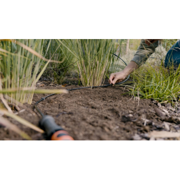 De GARDENA Micro-Drip-System Startset S voor 15m rijplanten is erg handig als je een waterbesparende en eenvoudige besproeiing van rijen planten en kwetsbare planten, zoals bijvoorbeeld tomaten, wilt hebben. Via een slang is het druk reducerende basisapparaat verbonden met een waterkraan. De druppelbuis is elke 30 cm uitgerust met zelfreinigende druppelaars en zorgt op deze manier voor een gelijkmatige besproeiing van rijplanten en plantenbedden.