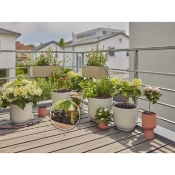 Met de Micro-Drip-Bewatering Balkon Set van GARDENA zorg je ervoor dat je balkonplanten op een betrouwbare en tijdbesparende manier bewaterd. Met deze set kun je tot wel 15 afzonderlijke potplanten of bloembakken met onderling verschillende hoogtes bewateren. Al de onderdelen die je nodig hebt zijn inbegrepen in de gebruiksklare set en het is makkelijk te installeren in slechts een paar stappen. Dankzij de Easy & Flexible koppelingstechnologie kan je het Micro-Drip-System altijd snel ombouwen of uitbreiden. De Seriedruppelaars gebruik je flexibel in bloembakken en als Einddruppelaars voor losstaande potplanten. Je kan je set uitbreiden met een handige GARDENA Besproeiingscomputer, zoals de Besproeiingscomputer Flex (art. nr. 1890-20), om de planten efficiënt te bewateren, waarmee je nog meer tijd bespaart. Zo zorg je goed voor je planten maar bespaar je toch water. Makkelijk en nauwkeurig bewateren, om water en tijd te besparen.
