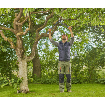 Sterke prestaties - eenvoudig te hanteren, de slimme oplossing voor krachtige snoei-uitdagingen. Met hoogwaardig stalen messen, geïntegreerde overdracht, een soepel lopende tandwielkast, een snoeidiameter van 50 mm en een ergonomisch ontwerp maakt de GARDENA EnergyCut Takkenschaar Pro S korte metten met jong hout en verdrievoudigt hij je snoeikracht. Krachtige snoeikracht De GARDENA Takkenschaar EnergyCut Pro S heeft twee precisiegeslepen messen van kwaliteitsstaal die aangedreven worden door een soepel lopende tandwielkast met geïntegreerde transmissie. De geïntegreerde transmissie zorgt voor een efficiënte krachtondersteuning en schakelt precies in wanneer de maximale kracht nodig is, wat de inspanning verkleint en de snoeikracht verdrievoudigt. Dit helpt om de zaagkracht van de gebruiker te verdrievoudigen en tegelijkertijd de belasting te verminderen, waardoor ruwe kracht wordt gecombineerd met comfort en precisie. Intuïtieve ergonomie Ergonomisch ontworpen en licht van gewicht met slechts 1135 g. Dit komt door de aluminium handgrepen en ergonomische ovale buizen voor comfortabel en moeiteloos snoeien van jong hout. De EnergyCut Pro heeft ook een polsbuffer om de belasting verder te verminderen en de polsen van de gebruiker te beschermen. Met een lengte van slechts 600 mm zorgen ze voor krachtig snoeien met de EnergyCut in een compact en draagbaar stuk gereedschap. Schoon en precies snoeien De precisiegeslepen messen van kwaliteitsstaal zorgen voor een nettere bypass-snede en gezondere planten. Bij bypass-snoeien passeren beide messen elkaar in een schaarachtige snede. Dit zorgt voor een schonere en preciezere snede die kneuzingen en verbrijzeling van de tak minimaliseert, wat het ideaal maakt voor jong hout. Deze GARDENA Takkenschaar EnergyCut Pro S is ook voorzien van GARDENA's PowerCoating voor eenvoudiger schoonmaken, efficiënter snoeien, verbeterde mesbescherming en gezondere planten. Langdurige scherpte De precisiegeslepen messen worden in Duitsland gemaakt volgens de hoge normen van GARDENA en zijn ontworpen voor een langdurige scherpte en snoei-efficiëntie, voor een lange levensduur.
