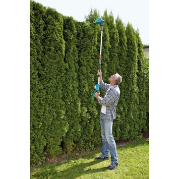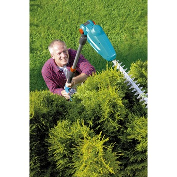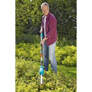 De Gardena telescopische heggenschaar THS Li-18/42 is perfect om zowel hoog als laag bij de grond te snoeien. Door de lichtgewicht telescopisch verstelbare steel kom je zonder moeite op lastig te bereiken plekken. Met een maximaal bereik van 3M is een hoge heg geen enkel probleem meer. De snoeikop kan kantelen, zodat ook de bovenkant van de heg vlak kan worden gesnoeid. De heggenschaar heeft met zijn 18V en 2,0Ah Lithium-Ion accu een gebruiksduur van maximaal 75 minuten. Op de indicator is te zien wanneer de accu moet worden opgeladen. Binnen 3 uur is uw accu weer vol. De heggenschaar is uitgerust met een 42 cm lang blad en kan takken snoeien met een maximale dikte van 16 mm.