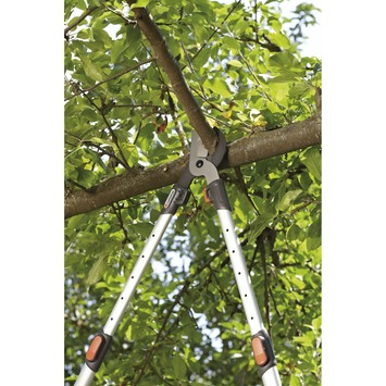 De Gardena telescopische takkenschaar Gardena 650BT is ideaal voor het snijden van jong hout met een diameter van maximaal 42 millimeter. Door de vergrote reikwijdte, kun je hogere takken eenvoudig bereiken. De uitschuifbare, robuuste aluminium hefboomarmen kun je instellen op 650-900 millimeter, waarmee je bijna overal bij kan. Door de lange hefboom en het lichtgewicht materiaal heb je minder kracht nodig voor het snoeien. De precisiegeslepen messen met antikleefcoating zijn eenvoudig schoon te maken. De grote aanslagdemper, gemaakt van speciaal kunststof, beschermt de gewrichten tijdens de werkzaamheden.