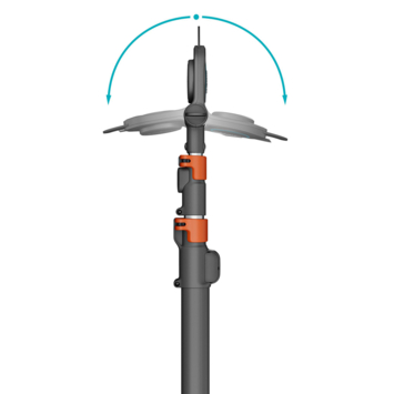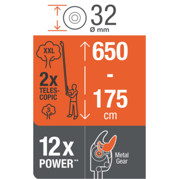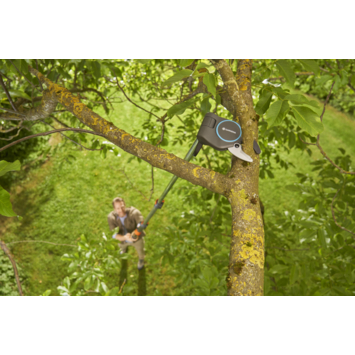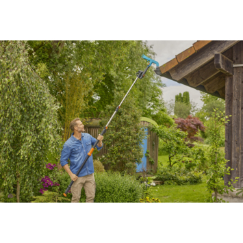 Sterke prestaties - Eenvoudig te hanteren, met een bereik van 175 cm tot 400 cm voor zowel kleine als grote bomen. De GARDENA StarCut Pro L Telescopische Takkenschaar met bypass-snede is de slimme compacte oplossing voor snoei-uitdagingen. Tot wel 2x groter bereik Geen tak ligt buiten je bereik met de StarCut Pro L. De snoeikracht van dit telescopische boomverzorgingsgereedschap wordt aangevuld door een buitengewone lengte, want hij is uitschuifbaar van 175 cm tot 400 cm, meer dan twee keer zoveel bereik. Dat biedt een totaal bereik van ongeveer 6,5 meter, afhankelijk van de lengte van de gebruiker. De compacte en ingekapselde snoeikop voorkomt dat hij verstrikt raakt tussen de takken, voor eenvoudig en probleemloos snoeien. De maximale snoeidiameter van 32 mm maakt korte metten met zelfs dikke takken. Krachtige snoeikracht Met messen gemaakt van kwaliteitsstaal en metalen tandwielondersteuning levert de GARDENA StarCut Pro L moeiteloos snoeiwerk, terwijl de compacte snoeikop zorgt voor eenvoudige toegang tot het begin van de tak. Dankzij de verwisselbare messen kan je snel en eenvoudig wisselen tussen de snoeikoppen, zonder moeite of gereedschap. Nette sneden De precisiegeslepen, stalen messen van hoge kwaliteit zijn gecombineerd met GARDENA's PowerCoating voor nette sneden en gezonde planten. Deze coating helpt wrijving te verminderen, waardoor de snoeiefficiëntie wordt verbeterd. Ook kan je de messen eenvoudiger schoonmaken en voorkomt het roestschade. Intuïtieve ergonomie De GARDENA StarCut Pro L heeft niet alleen een ongelooflijke reikwijdte, hij is ook nauwkeurig ontworpen voor gebruikscomfort en hanteerbaarheid. De verbeterde onderste handgreep biedt een veilige comfortabele grip, met een T-greep voor een betere hanteerbaarheid en stabilisatie. Een eenvoudige klem maakt snel en eenvoudig verlengen onderweg mogelijk en de snoeihoek kan eenvoudig aangepast worden vanaf de grond voor extra comfort en gemak. Langdurige scherpte De PowerCoated messen van de GARDENA StarCut Pro L Telescopische Takkenschaar met bypass-snede zijn in Duitsland gemaakt volgens de hoge normen van GARDENA en zijn ontworpen voor een langdurige scherpte en snoei-efficiëntie voor een lange levensduur.