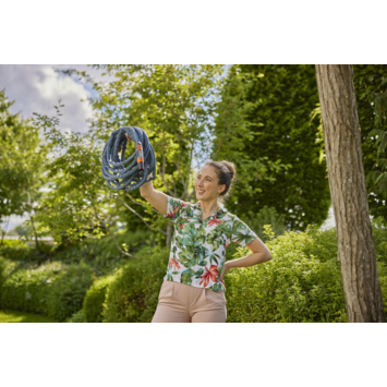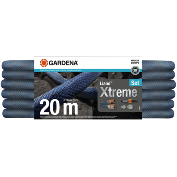 Gebruik de Textielslang Liano™ Xtreme 20 m Set van GARDENA voor langdurige en uitdagende bewatering. Met een totale lengte van 20 m is de textielslang met een diameter van 13 mm (1/2") ideaal voor middelgrote tuinen. De Original GARDENA System-accessoires Liano™ Slangstuk en Liano™ Waterstop zijn al voorgemonteerd op de Liano™ Xtreme. Daarnaast bevat de set twee Kraanstukken en een Reinigingspistool. Doordat een van de twee kraanstukken een reduceerstuk bevat, kan je de textielslang aansluiten op drie verschillende kraanformaten. De Liano™ Xtreme dankt zijn uitstekende prestaties, flexibiliteit en hoge bestendigheid tegen externe invloeden aan de zeer flexibele PVC-binnenslang en de innovatieve buitenslang, gemaakt van extreem bestendig textiel. Dit maakt hem duurzaam en klaar voor de veeleisende uitdagingen in je tuin. Hij overwint ruig terrein, keien, rozendoorns of slepen langs ruwe muren zonder te knikken of te blijven haken. Je kan de Liano™ Xtreme langdurig comfortabel gebruiken, dankzij de aangename, slipvaste textuur en het laag gewicht. De vuilafstotende textielslang is tot wel 50% lichter dan conventionele PVC-slangen. Na de bewatering kan je de Liano™ Xtreme ruimtebesparend opbergen, bijvoorbeeld op een plank of in een schuurtje, dankzij zijn goede flexibiliteit. Hij past zich aan aan de beschikbare opbergruimte. De slang is bestand tegen een maximale druk van 35 bar. Dankzij zijn uv- en vorstbestendigheid kan hij het hele jaar door in de tuin blijven. De textielslang is vrij van schadelijke stoffen zoals ftalaten (<0,1%), maar ook cadmium, lood en barium (<0,1%). Na registratie op gardena.com/registration binnen 3 maanden na aankoop geeft GARDENA je een lange fabrieksgarantie van 30 jaar op de hoogwaardige Textielslang Liano™ Xtreme, die is geproduceerd in Europa. Ontwikkeld voor het extreme. Ontworpen voor het alledaagse. Liano™ Textielslangen.